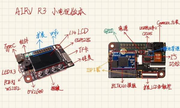 AIRV R3属AIRV的第三批次,相比前两批次(树莓派0外观)进行大调整,这次主要是针对USB口、DVP双目兼容性、红外补光、增加音频输入输出、增加2MB满血版ESP8285 WiFi、增加用户按钮和LED、增加WS2812B的RGBLED。同时还将整版缩小,集成度更高。R1和R2都有一个不方便固定CAMERA和LCD的诟病,这次R3的设计是直接板载了一块1.14寸IPS小屏幕,显示效果很棒,也根据结构将OV2640摄像头设计为即可超前安装、又可朝后安装的方式。
