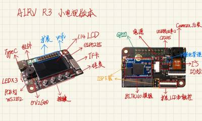 AIRV R3属AIRV的第三批次,相比前两批次(树莓派0外观)进行大调整,这次主要是针对USB口、DVP双目兼容性、红外补光、增加音频输入输出、增加2MB满血版ESP8285 WiFi、增加用户按钮和LED、增加WS2812B的RGBLED。同时还将整版缩小,集成度更高。R1和R2都有一个不方便固定CAMERA和LCD的诟病,这次R3的设计是直接板载了一块1.14寸IPS小屏幕,显示效果很棒,也根据结构将OV2640摄像头设计为即可超前安装、又可朝后安装的方式。