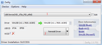 3. 打开 zadig, 选择 Options → List All Devices, 选择全志的设备, 点击安装驱动按钮