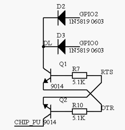 这部分电路使用两个NPN三极管巧妙的转换RTS和DTR到RST和DL的逻辑,真值表如下: