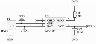 AIR在有USB线插入的状态可以给锂电池充电,这个是由LTC4054完成的。该电路十分简单,通过PROG引脚的电阻决定了锂电池的最大充电电流,根据手册的计算公式,使用3.3K的电阻实际横流充电电流为333mA。