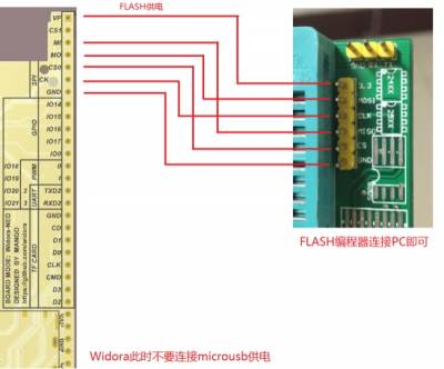 首先,保证不要给Widora供电,找到FLASH编程器的SPI编程接口(3.3VD、MOSI、CLK、MISO、CS、GND),使用杜邦线按照下图和Widora连接。
