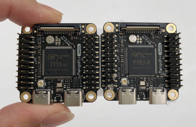 - F133(D1s) with 64MB DDR2, RISC-V core up to 1GHz for RTT