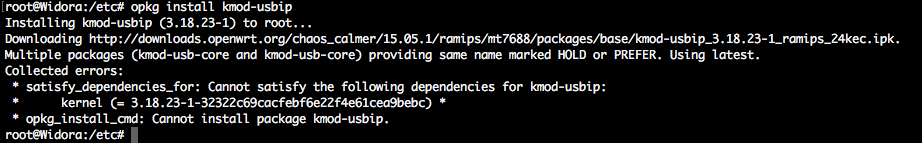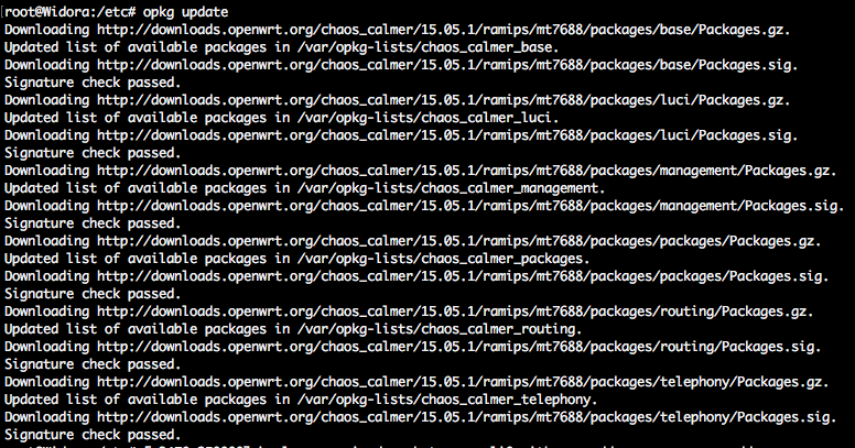 root@Widora:/etc/opkg# opkg install python Installing python (2.7.9-6) to root... Downloading http://dl.widora.io/chaos_calmer/15.05.1/ramips/mt7688/packages/packages/python_2.7.9- 6_ramips_24kec.ipk. Installing python-light (2.7.9-6) to root... ...... Downloading http://dl.widora.io/chaos_calmer/15.05.1/ramips/mt7688/packages/packages/python-pydoc_2.7.9-6_ramips_24k. Installing python-sqlite3 (2.7.9-6) to root... Downloading http://dl.widora.io/chaos_calmer/15.05.1/ramips/mt7688/packages/packages/python-sqlite3_2.7.9-6_ramips_2. Installing libsqlite3 (3081101-1) to root... Downloading http://dl.widora.io/chaos_calmer/15.05.1/ramips/mt7688/packages/packages/libsqlite3_3081101-1_ramips_24k. Installing python-unittest (2.7.9-6) to root... Downloading http://dl.widora.io/chaos_calmer/15.05.1/ramips/mt7688/packages/packages/python-unittest_2.7.9-6_ramips_. Installing python-xml (2.7.9-6) to root... Downloading http://dl.widora.io/chaos_calmer/15.05.1/ramips/mt7688/packages/packages/python-xml_2.7.9- 6_ramips_24kec. Configuring python-base. Configuring libffi. ...... Configuring python-unittest. Configuring python-xml. Configuring python. Configuring python3-asyncio.