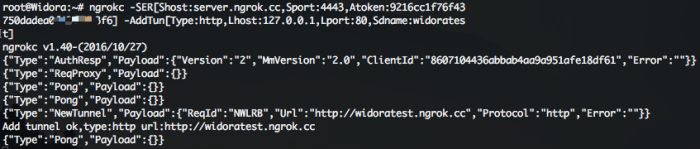 命令: ngrokc -SER[Shost:server.ngrok.cc,Sport:4443,Atoken:9216cc1f76f43750dadea0xxxxxxxx] -AddTun[Type:http,Lhost:127.0.0.1,Lport:80,Sdname:widoratest]