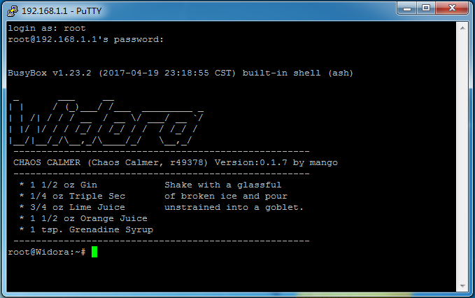 mangodeMacBook-Pro:~ mango$ telnet 192.168.1.1 Trying 192.168.1.1... Connected to bogon. Escape character is '^]'. BusyBox v1.23.2 (2017-04-19 23:18:55 CST) built-in shell (ash) _ ___ __ | | / (_)___/ /___ _________ _ | | /| / / / __ / __ \/ ___/ __ `/ | |/ |/ / / /_/ / /_/ / / / /_/ / |__/|__/_/\__,_/\____/_/ \__,_/ ----------------------------------------------------- CHAOS CALMER (Chaos Calmer, r49378) Version:0.1.7 by mango ----------------------------------------------------- * 1 1/2 oz Gin Shake with a glassful * 1/4 oz Triple Sec of broken ice and pour * 3/4 oz Lime Juice unstrained into a goblet. * 1 1/2 oz Orange Juice * 1 tsp. Grenadine Syrup ----------------------------------------------------- root@Widora:/#