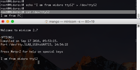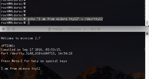 root@Widora:/# echo “I am from widora ttyS2” > /dev/ttyS2